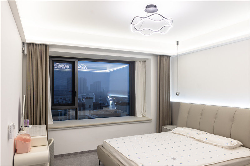 飄窗區(qū)鋪上毯子,鑄就休閑賞景一角;梳妝臺為組合柜體,以高度差異實現(xiàn)功能互補(bǔ);床頭背景墻色彩拼接,以輔燈點綴及藝術(shù)燈增強(qiáng)美感。
