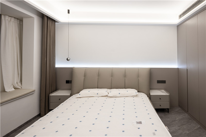 臥室作為休息和獨處的空間,安靜而溫馨是必須的,顏色搭配、功能收納的協(xié)調(diào)統(tǒng)一,是屋主品質(zhì)追求的外在呈現(xiàn)。