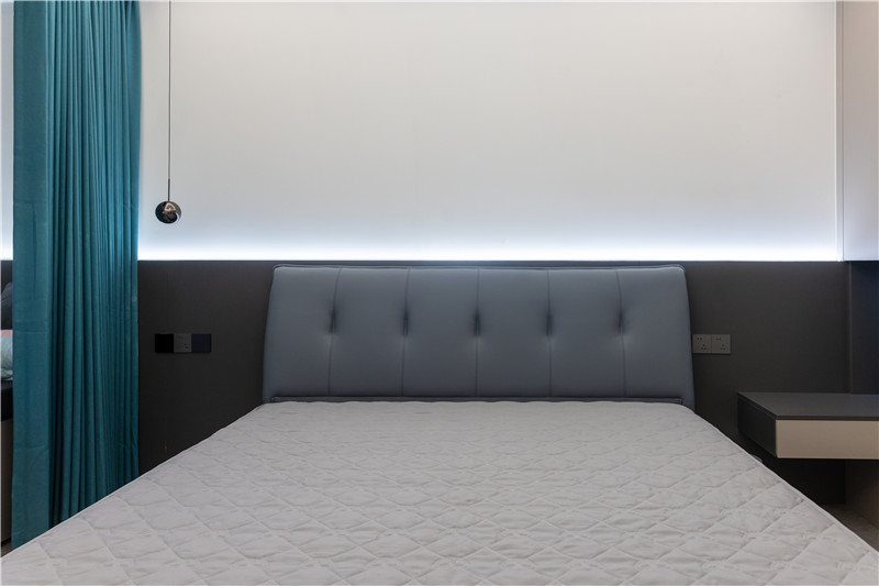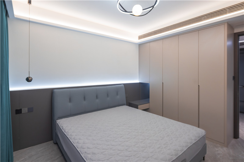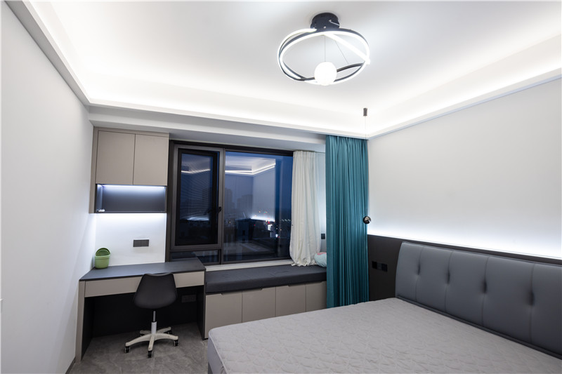 進(jìn)門靠墻立柜延伸床頭柜,內(nèi)側(cè)色彩協(xié)調(diào)以床頭背景墻,干脆利落;靠窗收納柜與書桌錯位結(jié)合,便捷實用;整屋主燈與輔燈結(jié)合設(shè)計,氛圍感在線。