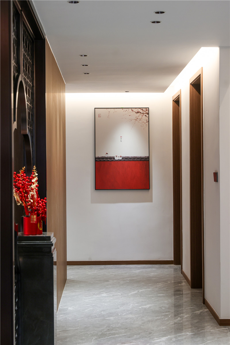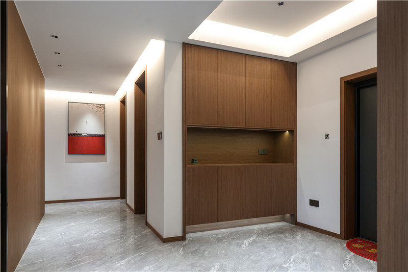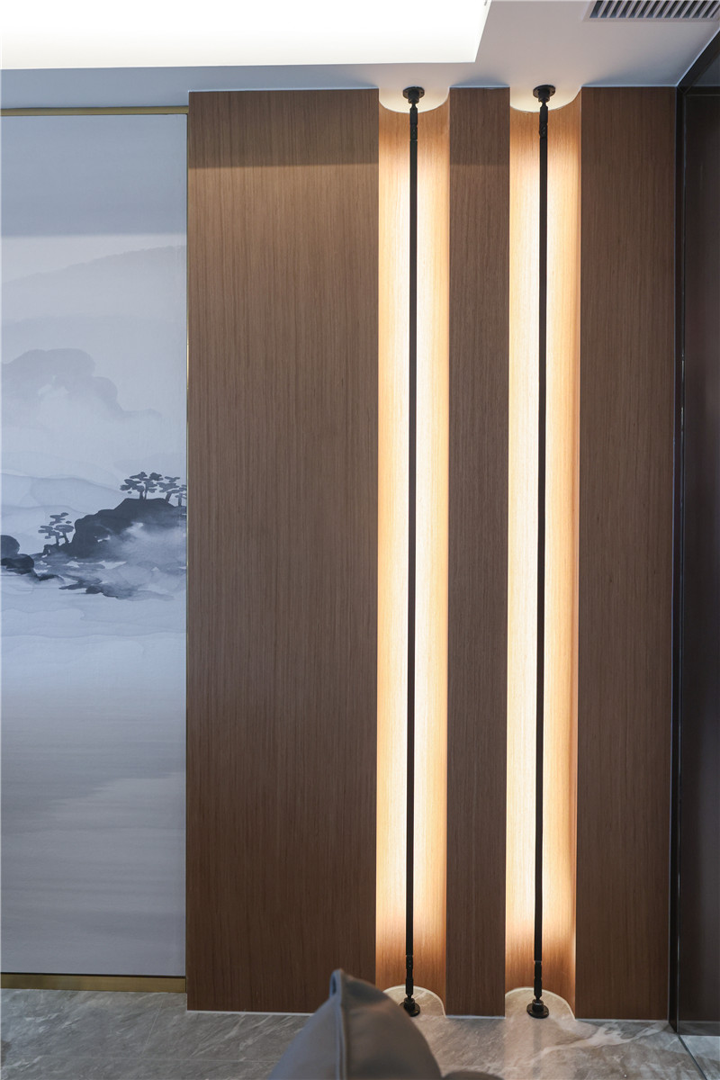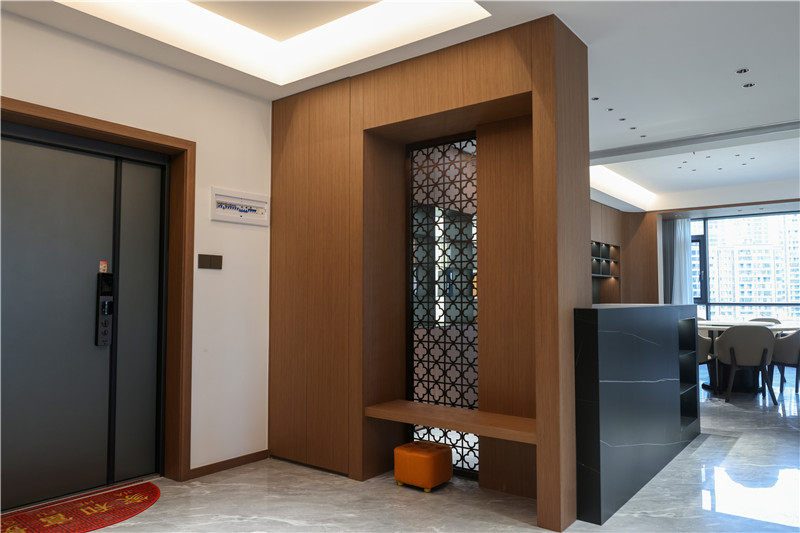 玄關(guān)處的設(shè)計讓人眼前一亮,柜子以客來福橡木展現(xiàn)中式設(shè)計的分量感。