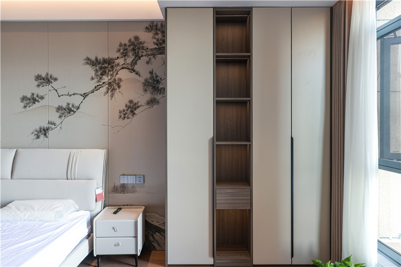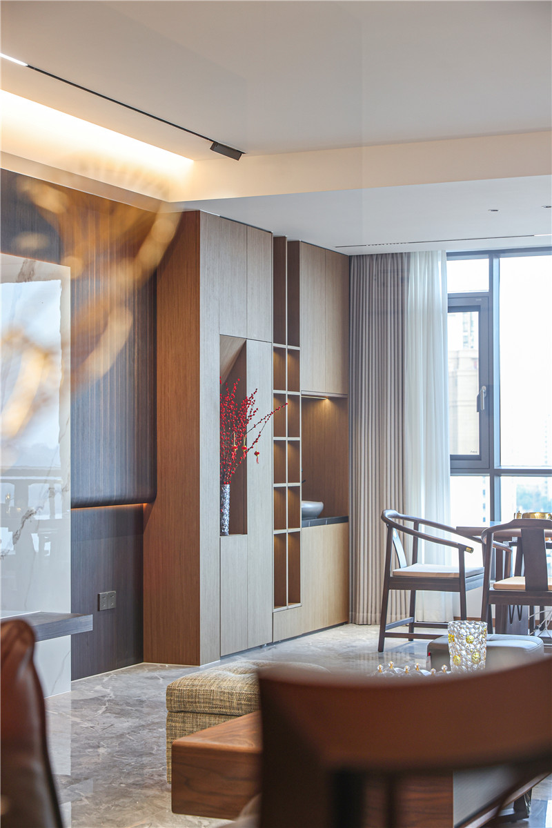 一側(cè)柜體為掛衣存儲區(qū),無拉手柜門協(xié)調(diào)視覺、休憩座緩解疲勞,背板加入中國結(jié)屏風(fēng)隔斷,中式意境突顯。