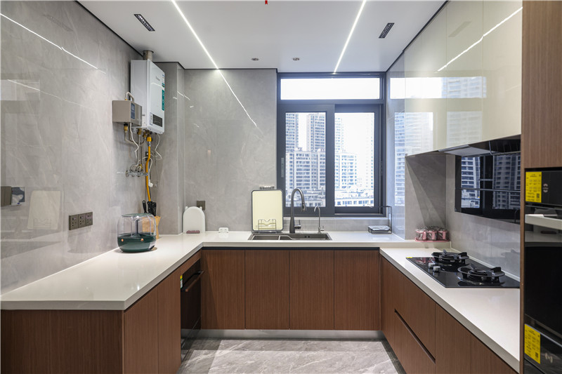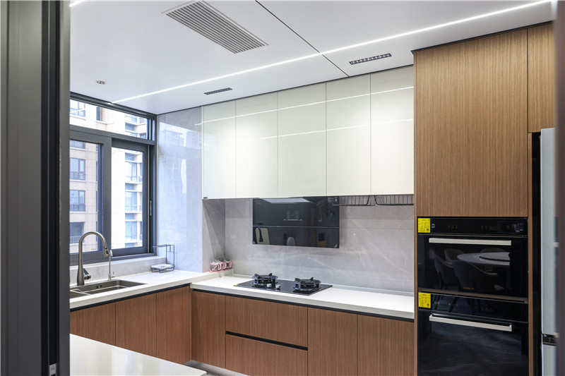 廚房客來福橡木柜體配合以巖板,溫馨柔潤,其整體U型構(gòu)造遵循智慧動線,實用性強(qiáng);根據(jù)實際需求將烤箱等大電器嵌入地柜、高柜中,讓空間有效歸整。