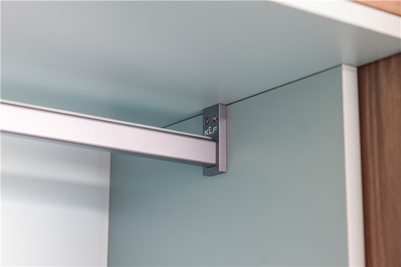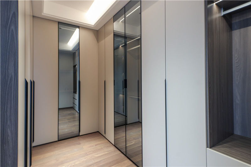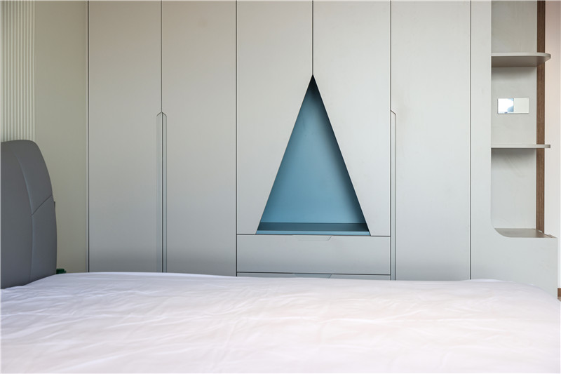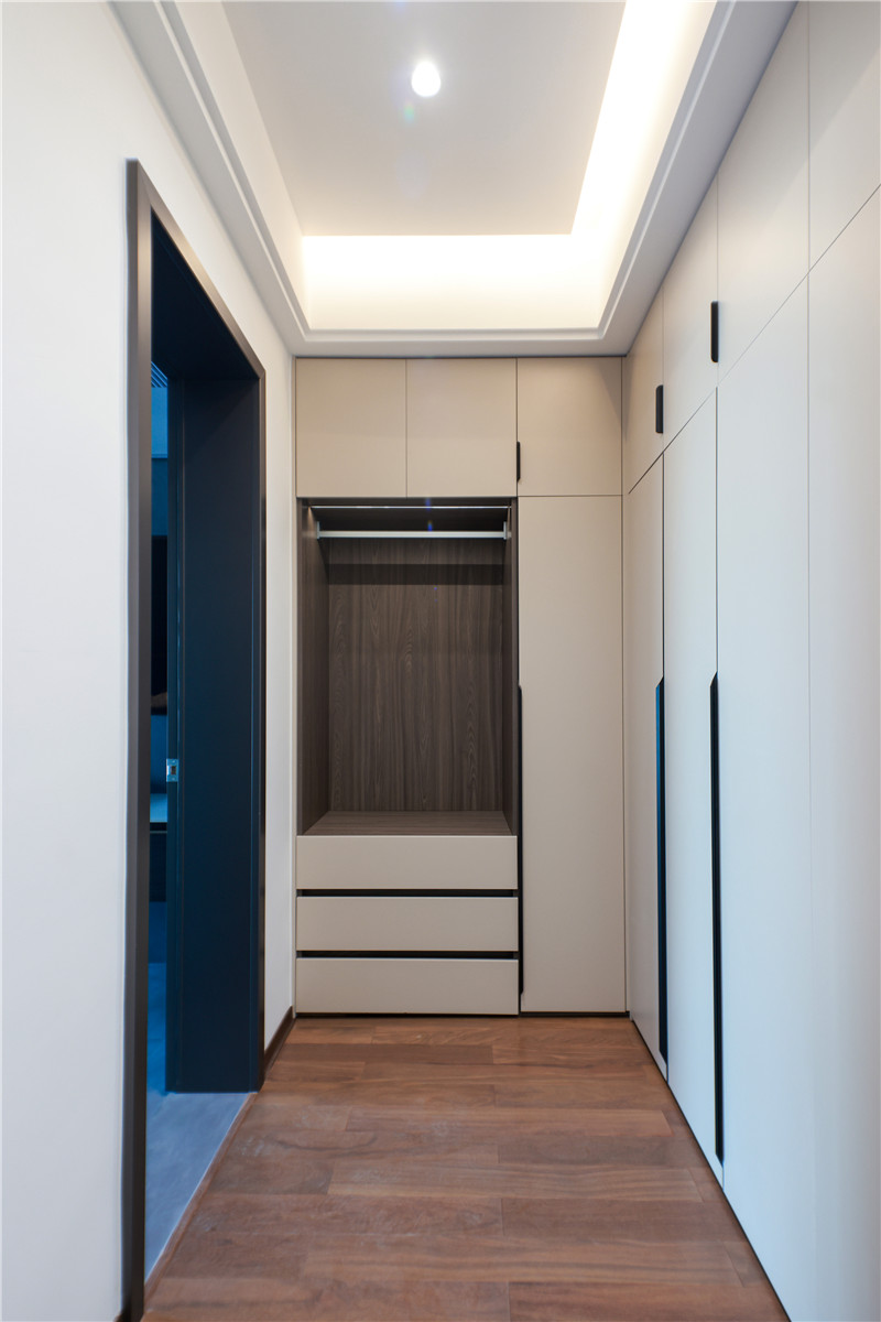 主臥內(nèi)有小型衣帽間,狹長區(qū)域做到頂立柜,一側(cè)做掛疊結(jié)合區(qū)、一側(cè)做長柜,有效保障多重收納與整潔需求。