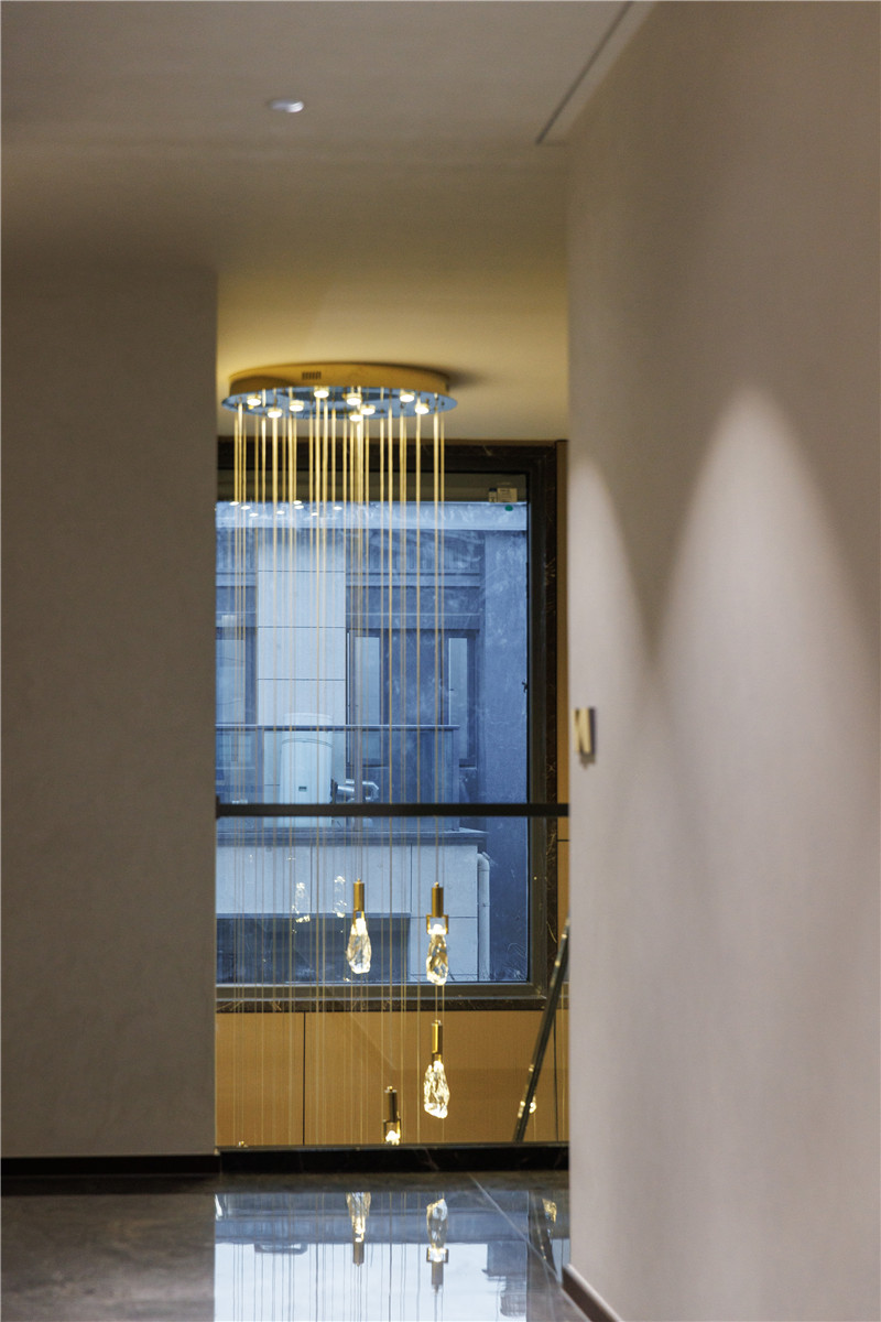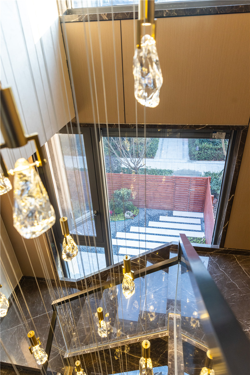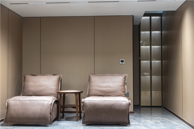 梯座上方設置休息區(qū),談心、小聚可在這里實現;背側做狹長展示柜,夾絲玻璃、內嵌燈帶,顏值UP!