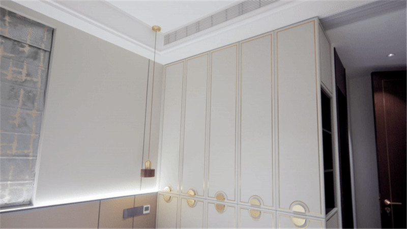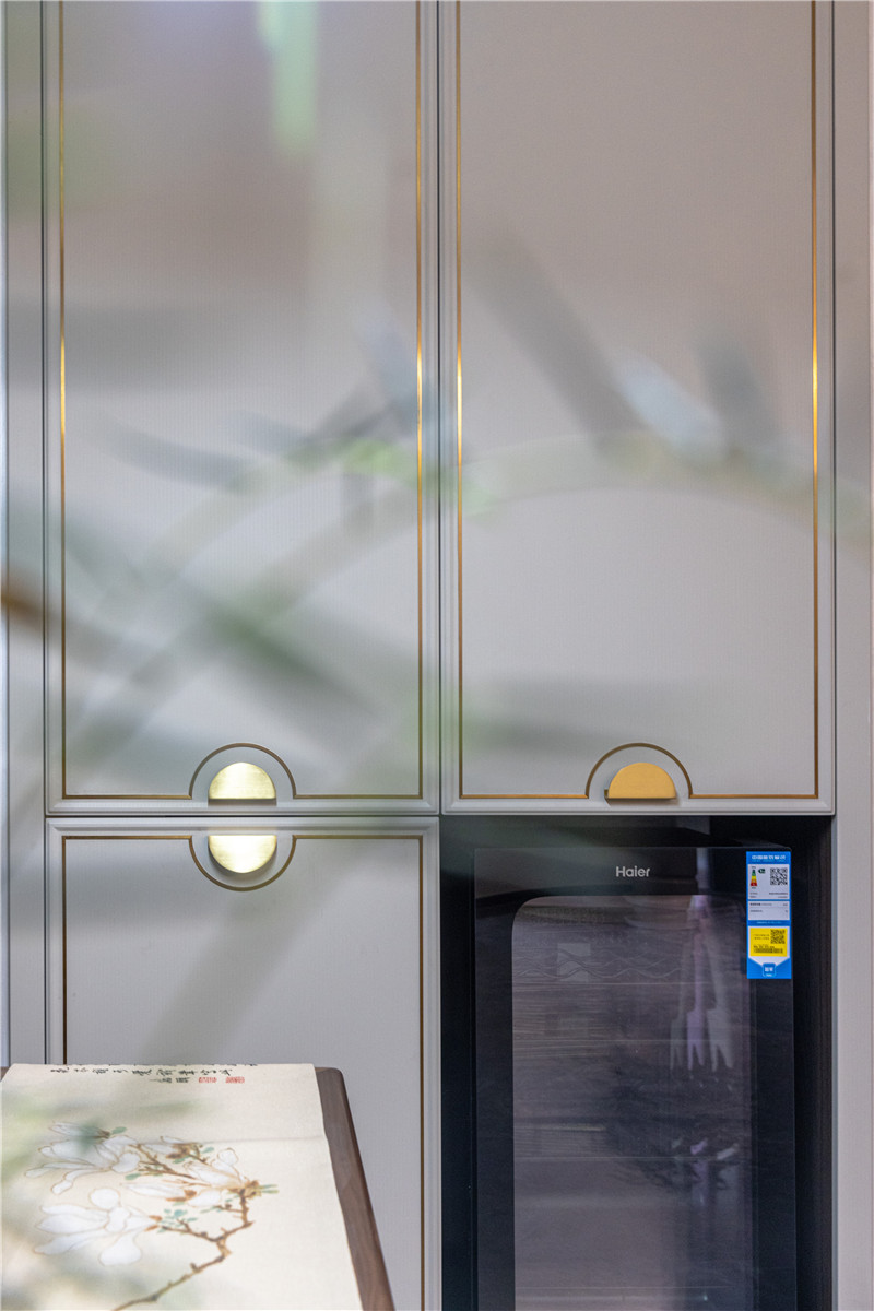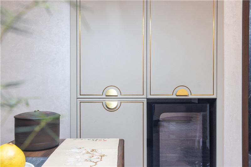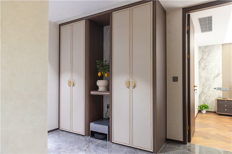 一組一柜到頂柜,中部隔層造景,加入換鞋凳并合理預留掃地機器人放置區(qū),合理且細致;兩側邊米褐色門板以金屬條點綴,配以中式扇形拉手,好看實用。