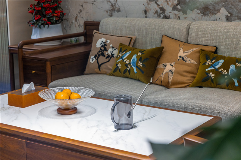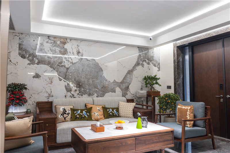 客廳采用中式圍合式構造,茶幾、沙發(fā)、椅子為配套木材,方寸間的沉淀襯中式風骨;沙發(fā)背景墻采用整面大理石紋板,亮光屬性呼應輔助燈光,增加空間通透感。