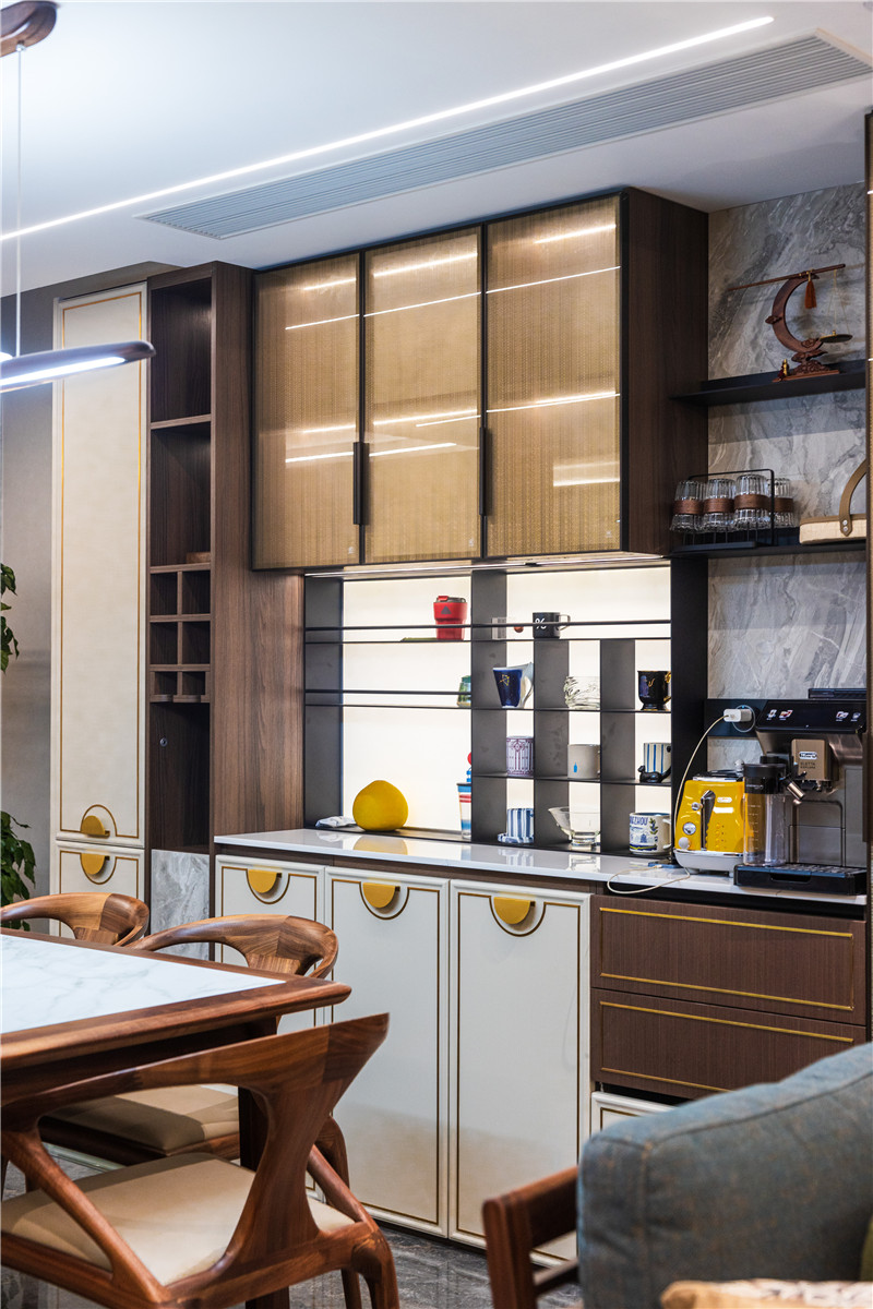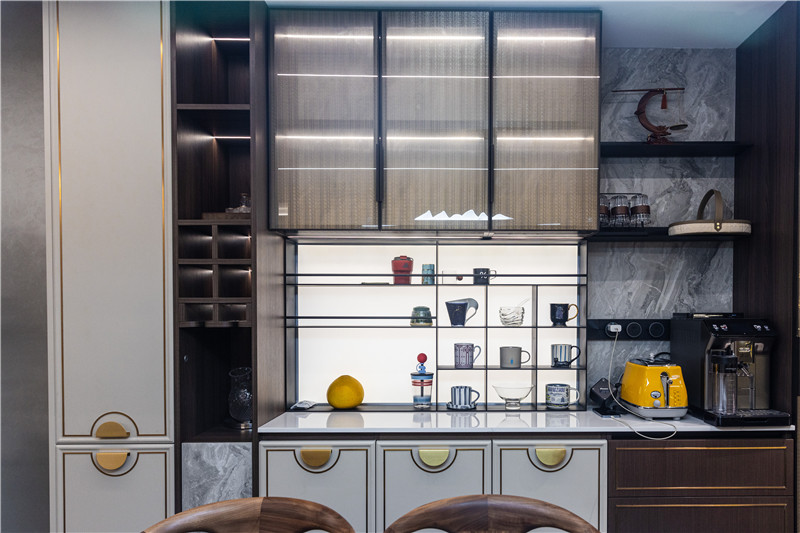 餐邊柜整體組合式構造,煙熏橡木與米褐浮雕搭配,展現出高定美感;餐邊柜背板為大理石紋,中部為鋁板裝飾柜,打開燈光增強層次感。