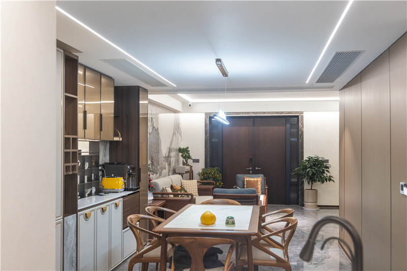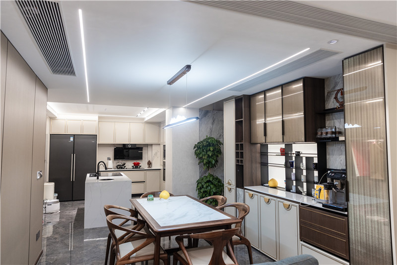 餐廚空間整體為開放式構造,烹飪與用餐動線明晰,方便家庭成員共同參與其中;餐廚空間協調于整屋新中式裝修,主燈與輔燈結合式設計,空間敞亮。