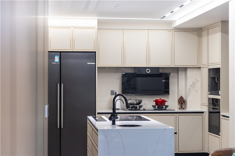 櫥柜上下柜無拉手設計,轉角處高柜嵌入烤箱等大電器,視覺和諧且收納力強;一側獨立式島臺,設置以洗水槽及嵌入式設備,分散櫥柜壓力。