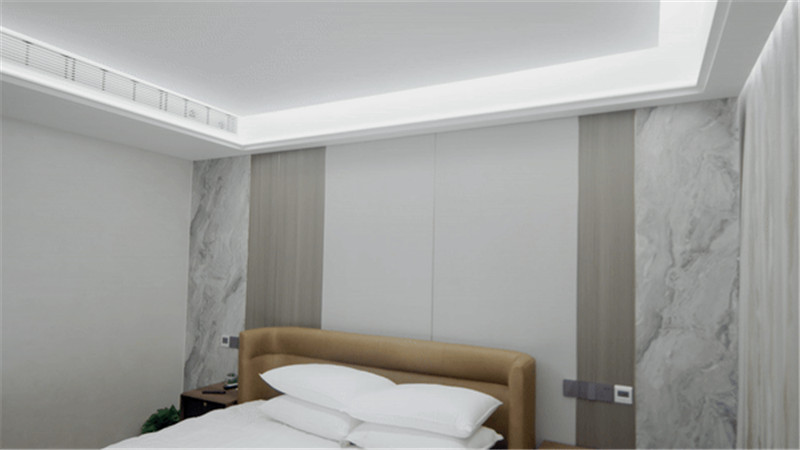 次臥床頭背景墻橫向拼接,拼接處嵌入條帶燈光,配合以藝術床頭燈,滿滿氛圍感;側邊立柜增強空間存儲力,側邊掏空裝飾,整體裝修展示性強。