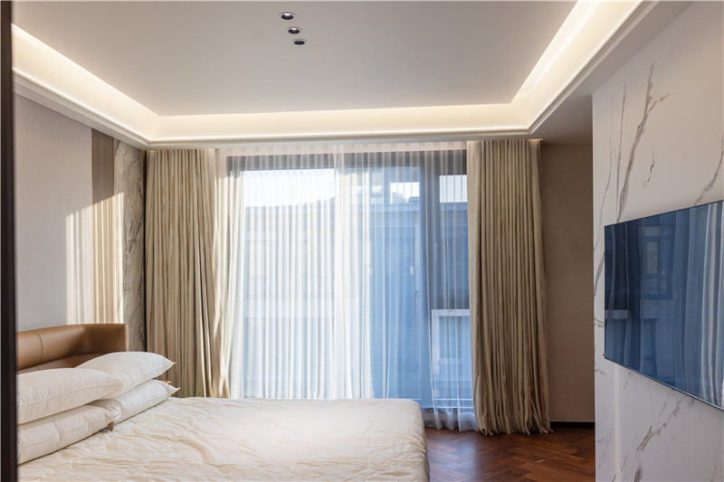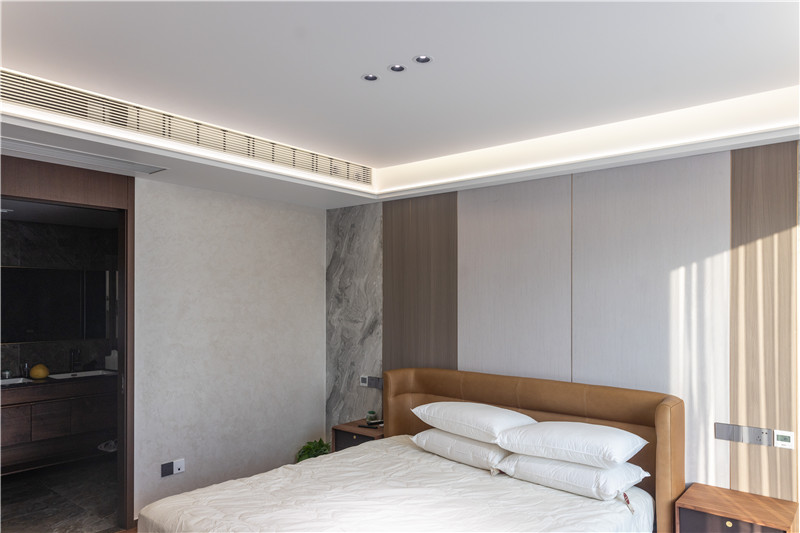 床頭背景墻木調與白調組合,提前預留好插座位置,實用便捷;床尾一字型組柜,夾絲玻璃為裝飾柜、木質柜為收納柜,和諧統(tǒng)一。