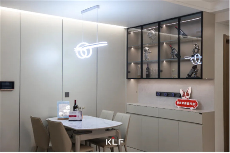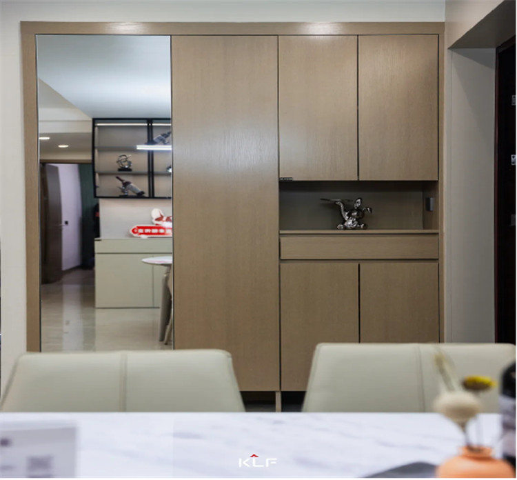 餐邊柜與護(hù)墻板色調(diào)統(tǒng)一,顯得空間和諧寬敞;玻璃吊柜內(nèi)置燈帶,既起到調(diào)節(jié)大面積茶白色帶來的素凈氛圍,又很好呈現(xiàn)輕奢風(fēng)強調(diào)的精致細(xì)節(jié);免拉手設(shè)計簡約實用,也減少日??呐?。