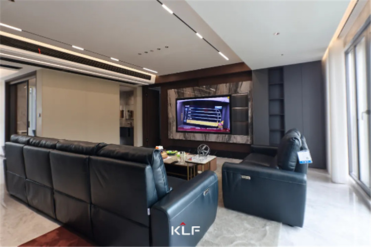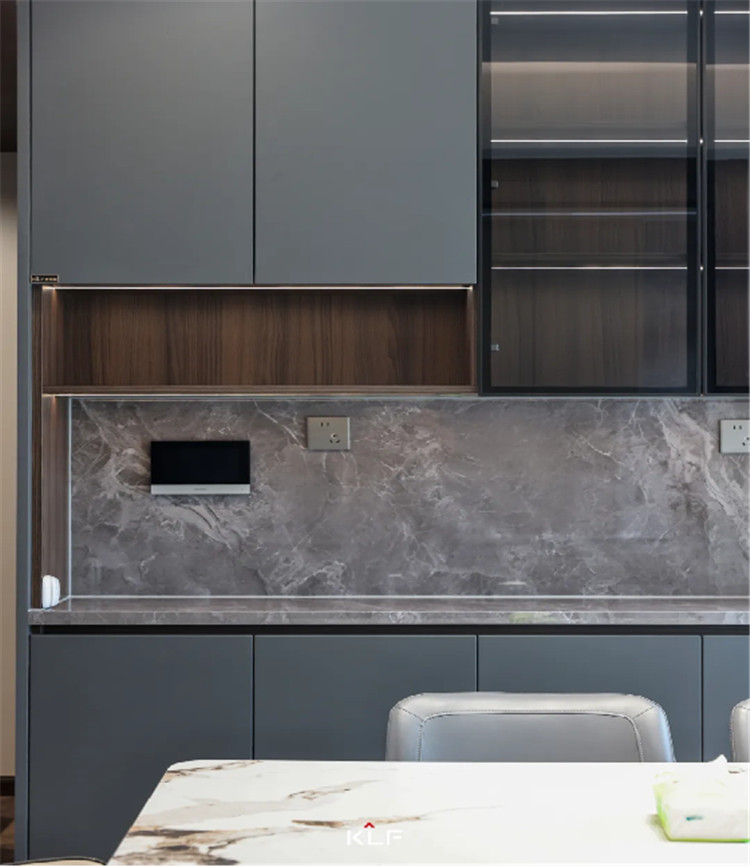 沙發(fā)背景墻被打造成整面收納柜,開放與封閉的組合設計,讓收納與展示完美融合。純木色無拉手一門到頂柜,局部選用巖板、玻璃進行點綴,高級感拉滿。嵌入式設計容納了冰箱和洗衣機烘干機,精簡的設計,給予居者更豐富的視覺感受。