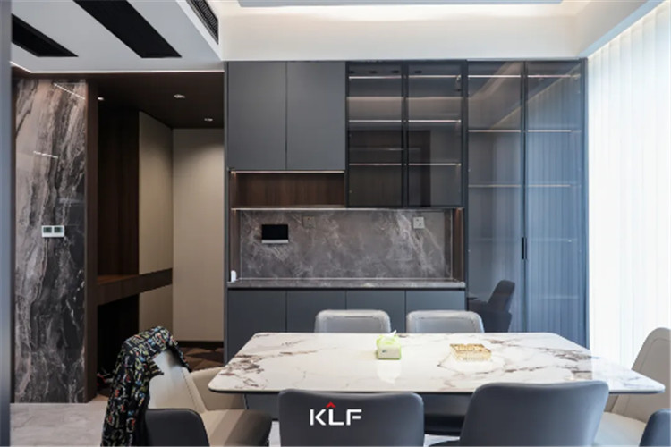 整面餐邊柜立于大理石餐桌一側,儲物及展示功能拉滿的同時,線條和形式的韻律演繹出現代化的家居美學。色調柔和、質感高級的水漆柜搭配上通透玻璃,清新淡雅,營造典雅雋永的氛圍。