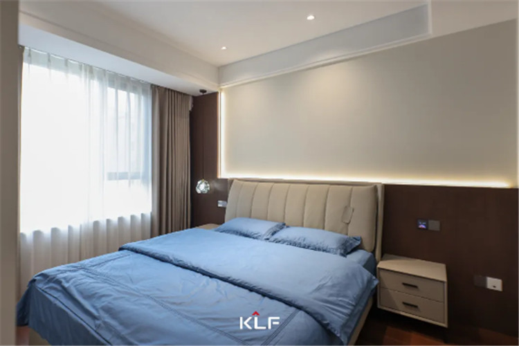 臥室沒有過多繁瑣的裝飾,床具造型簡潔、線條流暢。用木質護墻板打造半高床頭背景墻,恰到好處的留白,空間更靈動。