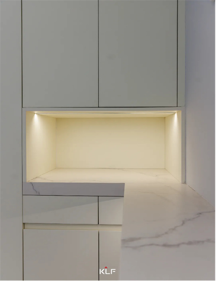 餐邊柜收起生活的繁雜,還原高端定制的有序與雅致。設(shè)計師延伸柜體轉(zhuǎn)角后在地柜上留了一個西廚的操作臺,中西廚結(jié)合,包容每一位家人的飲食習(xí)慣,讓用餐與烹飪自成一體,傾情享受他們的“食光”。