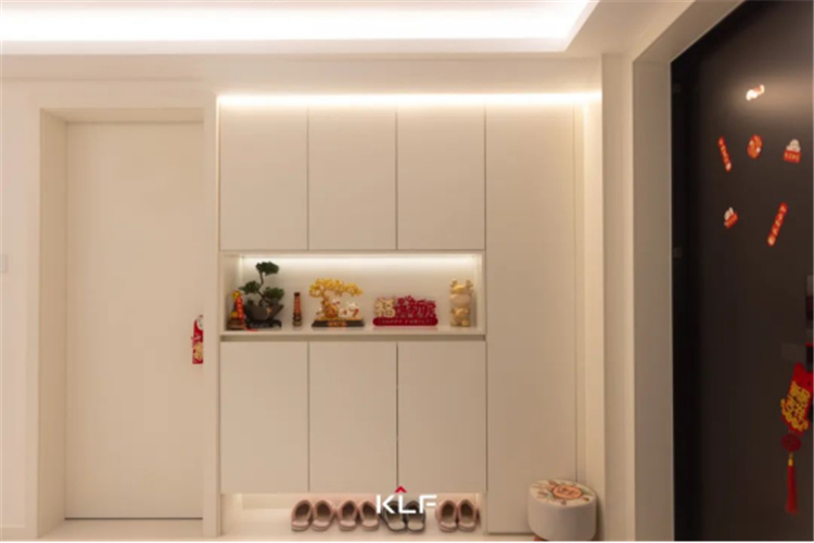初見這個家,便有種一鏡到底的酣暢感,素雅色彩與洗練線條一路鋪陳,進(jìn)門便跌進(jìn)奶油色系的環(huán)抱中。入戶區(qū)域一側(cè)的奶油色到頂玄關(guān)柜美觀實用,鏤空設(shè)計方便進(jìn)出門換衣?lián)Q鞋和放置日常物品。褪下外部世界紛擾,療愈每一顆歸家的心。