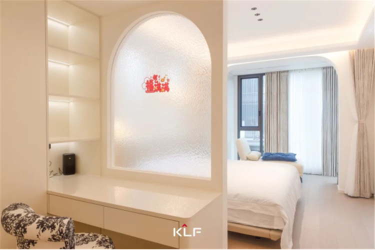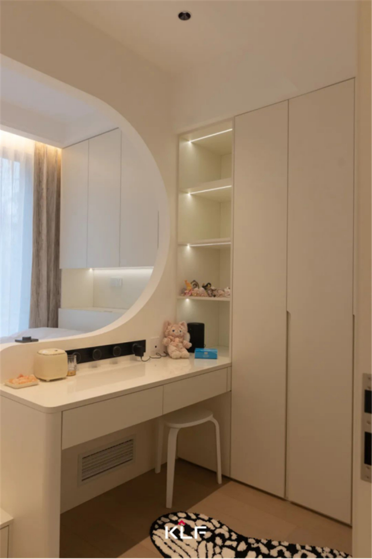 設(shè)計解鎖更加精簡的生活方式,打造流暢的洄游動線。以柜為墻圍合出一隅衣帽間和梳妝臺,與主臥構(gòu)成嵌套關(guān)系,提升空間利用率和居住便利性。床頭背景墻、門洞埡口、玻璃隔斷,多處采用圓弧線條勾勒輪廓,具體而微的細(xì)節(jié),消弭大面積純色的乏味和單調(diào),交匯成生活的豐富質(zhì)感,滿足居住者的審美期待。