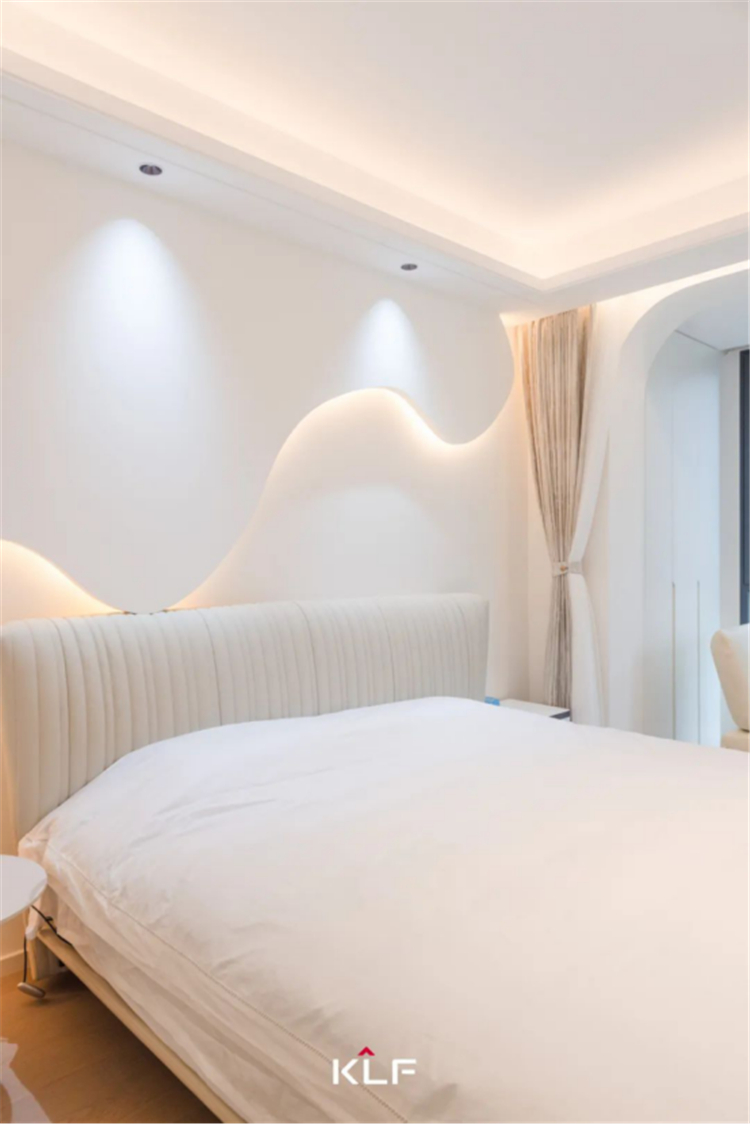 主臥自成一方靜謐天地,至簡淺淡,如云朵般輕盈,循著留白的韻腳酣眠其間。臨光的通透感蒙上一層朦朧濾鏡,呈現(xiàn)出寧靜無壓的舒適感。