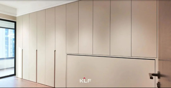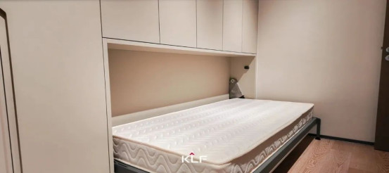 衣帽間采用“一門到頂”的設(shè)計,柜體與墻面接縫處不留縫隙,減少衛(wèi)生死角。衣柜內(nèi)部結(jié)構(gòu)合理,分區(qū)明確。銑槽拉手柜門平整順滑,強迫癥黨看了表示超舒服。折疊床柜一體設(shè)計暗含巧思,打開便是一張折疊床,偶有客人留宿不是問題。