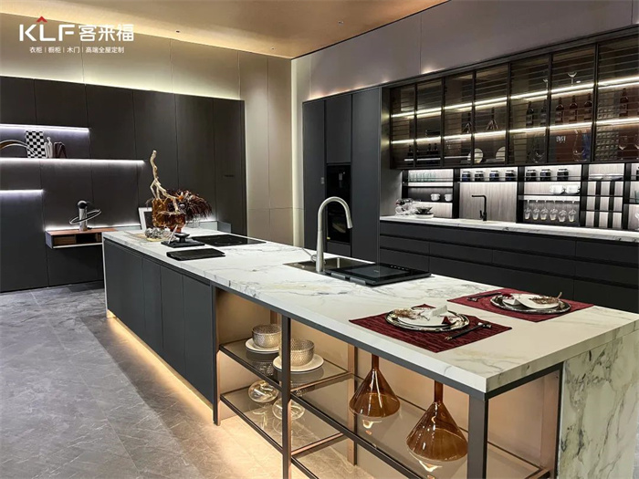 將客廳與開放式廚房打造成整體空間是升級的亮點之一,PET的工藝幫助我們實現(xiàn)嵌入式的內(nèi)置功能,比如衛(wèi)生間的燈光和冰箱。除此之外,整家定制也是客來福今年的著力點,多功能的產(chǎn)品柜和開放式的設(shè)計模糊了空間界限。根據(jù)消費者對于一站式一體化的消費需求提供了解決方案。