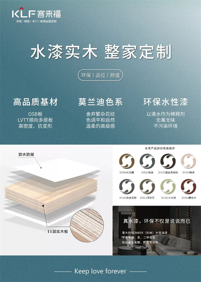 自品牌成立之初,客來福就以“全屋健康定制”為發(fā)展方向,為中國家庭提供健康、舒適、時尚的家居空間解決方案。