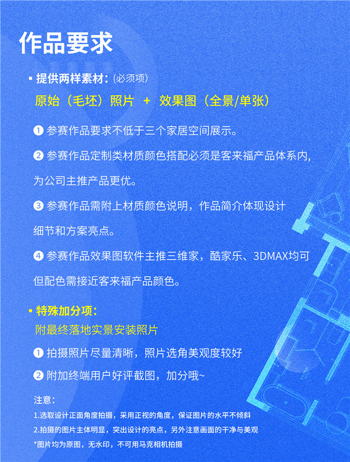 注:所有作品必須為本年度內(nèi)設(shè)計師獨立完成的方案,如有盜取、冒用他人作品的一經(jīng)查實取消參賽資格,并通知當?shù)亟?jīng)銷商。