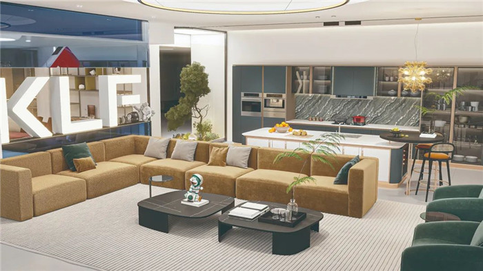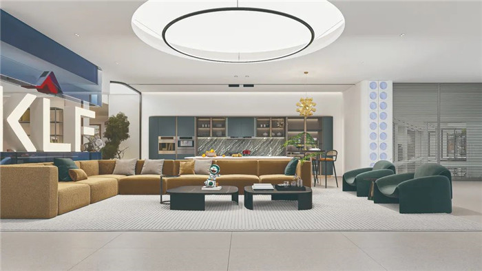 客廳采用藍(lán)色亞克力漸變設(shè)計(jì),同時(shí)做了品牌Logo的結(jié)合,既作為隔斷之用,也承載著品牌IP和視覺的傳達(dá)。