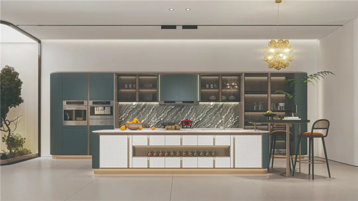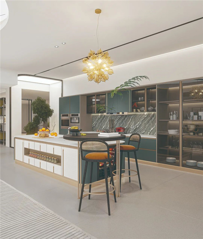 作為社交型廚房的核心區(qū)域——島臺的設(shè)置,既滿足了日常的備餐功能,也是對社交功能的拓寬。從烹飪場所升級到社交場所,空間的連接,亦是情感的橋梁,升華家的溫度,豐盈家的想象。