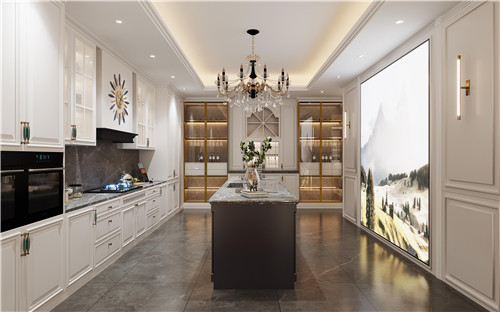 石英石臺(tái)面的中島臺(tái)一方面起到了增加廚房操作臺(tái)的功能,提高了生活的舒適度,另一方面可以充當(dāng)餐桌,偶爾約上三五好友在這里喝酒或者聊天非常愜意。