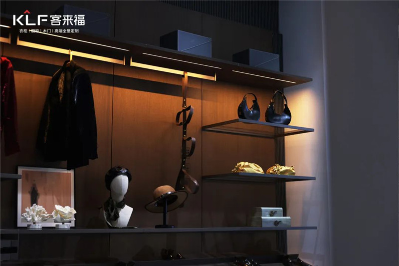 整體空間以藍琺瑯和茶白的色彩碰撞打造家居美學,衣帽間開放柜內采用了超薄層板設計,設計不冗繁,營造出空間懸浮感。