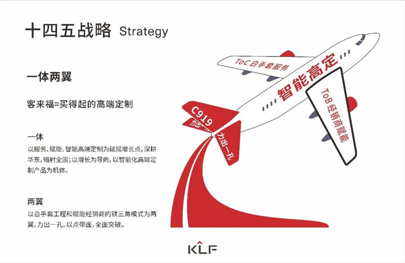 在2023年,客來福更是提出了“一體兩翼”的戰(zhàn)略計(jì)劃,以智能高定為核心關(guān)鍵詞,做買的起的高端定制家居;以to b賦能經(jīng)銷商、to c白手套工程服務(wù)客戶,以點(diǎn)及面,全面突破。