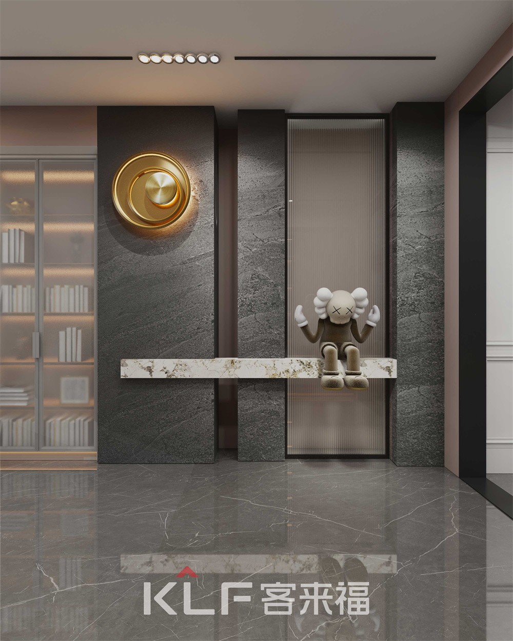 入戶空間造景區(qū)與鞋柜相互呼應(yīng),精致的長虹玻璃作為情緒與視覺的點睛,填充空間空白的同時,也衍生出生活美學(xué)的設(shè)計感與儀式感。