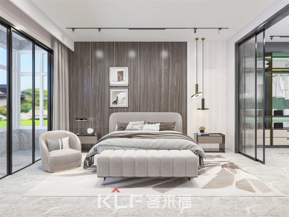 臥室多使用深色系列,創(chuàng)造色彩差異,右側柵格的黑橘兩色,搭配輕奢風的華貴與簡約低調碰撞出火花,每一處都擊中時尚潮流范。
