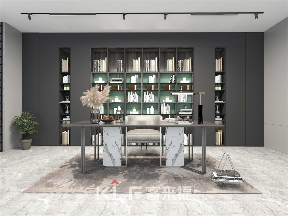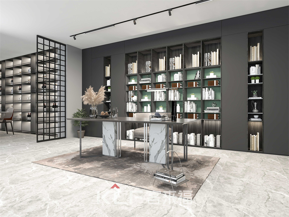 色彩搭配以素雅為主,搭配金屬元素點綴,低調有質感。偏黑色墻面帶來深沉,給人以思考的寧靜。突出簡約風,質樸演繹化繁為簡,更顯高級,用極簡風格的設計淬煉出直擊心靈的美感。