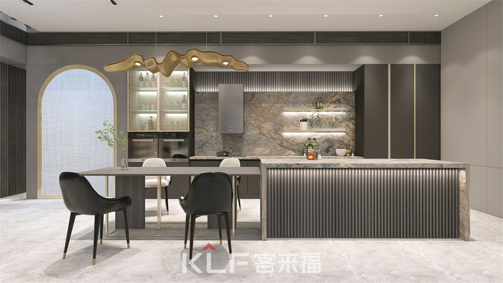 餐桌與島臺(tái)一體化連接,波紋的垂直設(shè)計(jì),展現(xiàn)了餐廳空間的靈動(dòng)感。冰箱采用內(nèi)嵌式設(shè)計(jì),外觀風(fēng)格更加統(tǒng)一美觀。直筒油煙機(jī)將做飯時(shí)的油煙盡收其中,避免空間內(nèi)大面積油煙四散,保持空間環(huán)境清潔干爽。